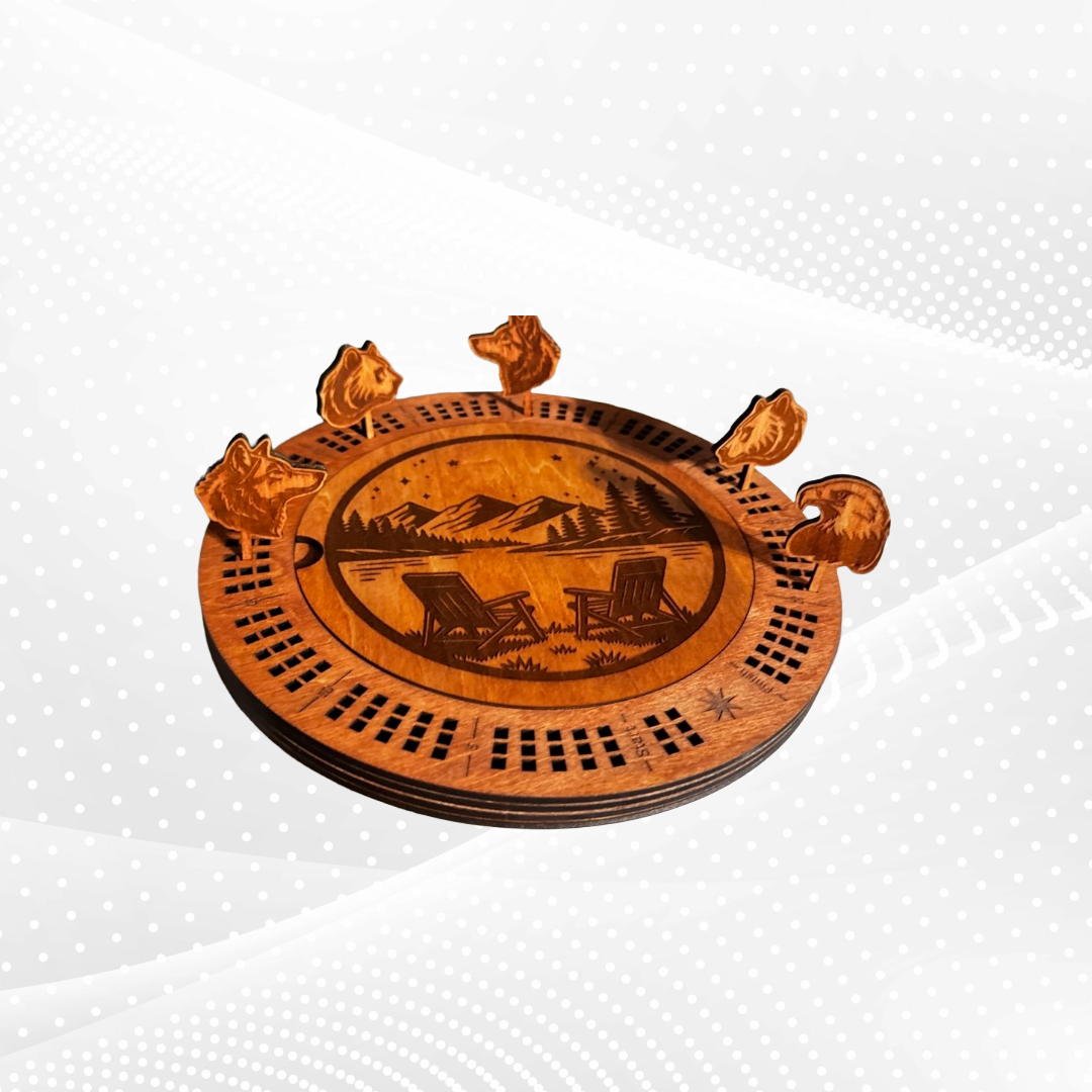 Round Cribbage Board, Lake/Mountains Theme, Square Holes, 6x Wooden Animal Pegs, Top Peg Storage.